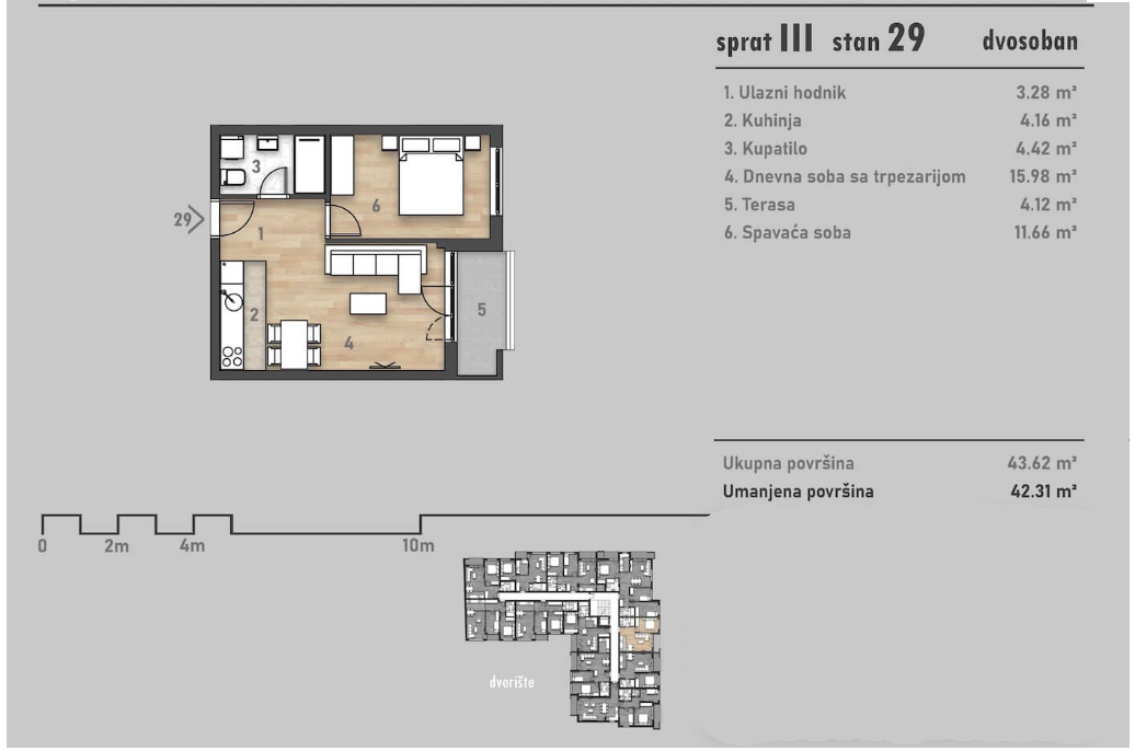 Struktura: dnevni boravak sa kuhinjom i trpezarijom, spavaće soba, kupatilo, hodnik i terasa.