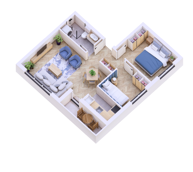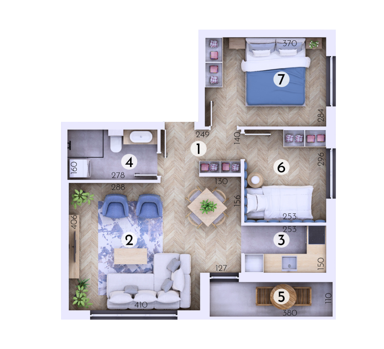 Stan se sastoji od: prostrane dnevne sobe sa trpezarijom i kuhinjom, dve spavaće sobe, kupatila, terase i hodnika.